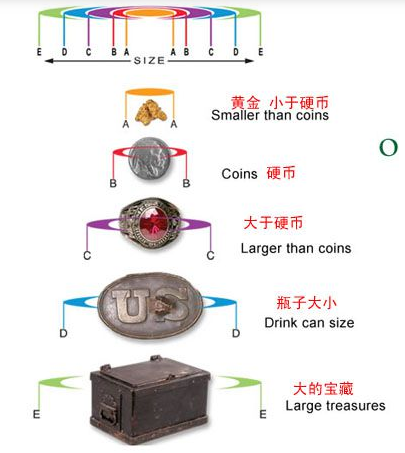 五個號都會顯示在顏色編碼的成像網格上,根據目標在網格上的位置不同,目標的深度也以兩英寸的級別遞增。探測器在工廠預設模式下,只有按住TREASURE IMAGING,目標的尺寸與深度才會顯示出來。在圖像搜索狀態下,所有被探測器發現的物體的大小和深度都會顯示出來。