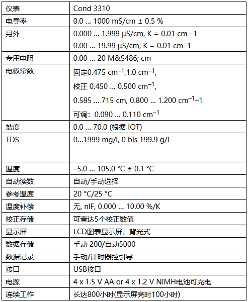 德國(guó)WTW Cond3310型便攜電導(dǎo)率儀set1產(chǎn)品技術(shù)參數(shù):