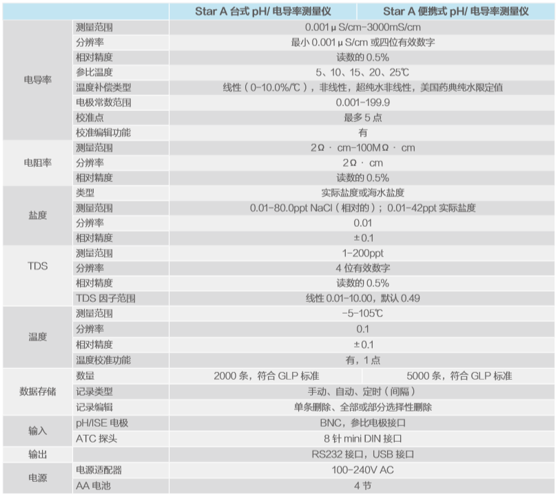 美國ORION奧立龍Star A 系列臺式及便攜式 pH/ 電導率測量儀產品技術參數: