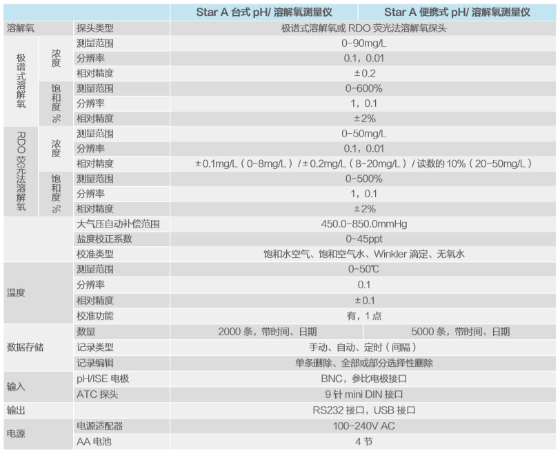 美國ORION奧立龍Star A 系列 pH/ 溶解氧臺式及便攜式測量儀產(chǎn)品技術(shù)參數(shù):