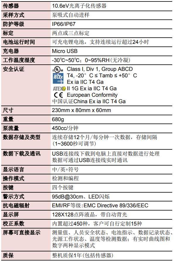 美國(guó)MPOWER PPB18X 手持式VOC檢測(cè)儀產(chǎn)品技術(shù)參數(shù):